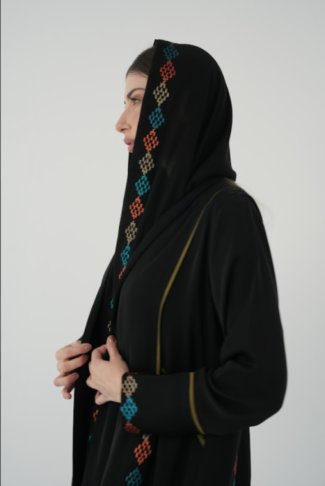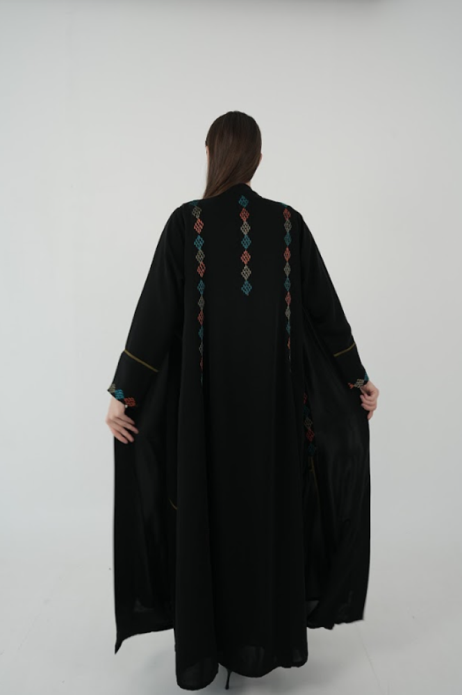 عباية اسود من قماش الكريب الناعم الخفيف مطرزه بالكامل بألوان هادئه ومقصوصه بقصة A
