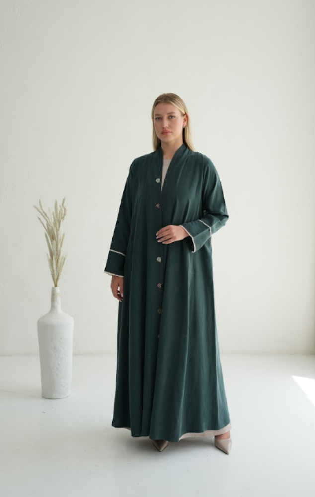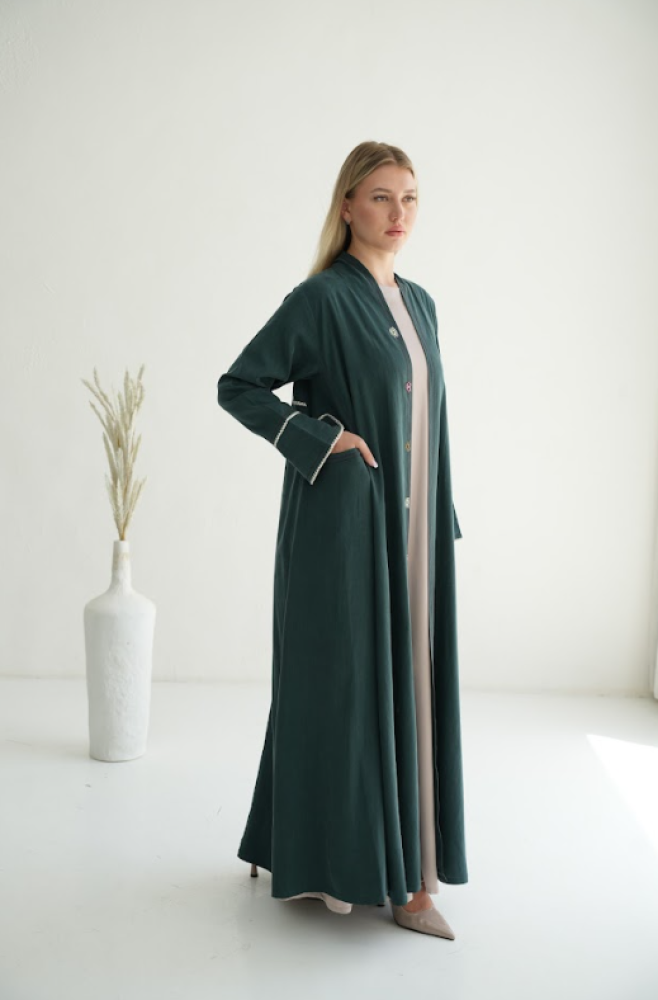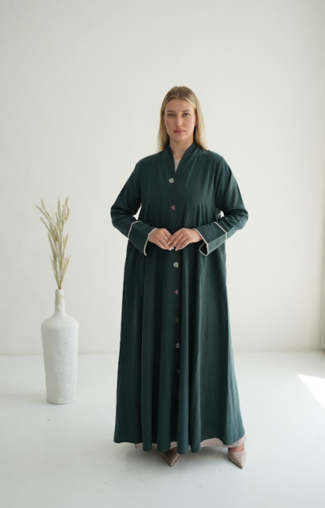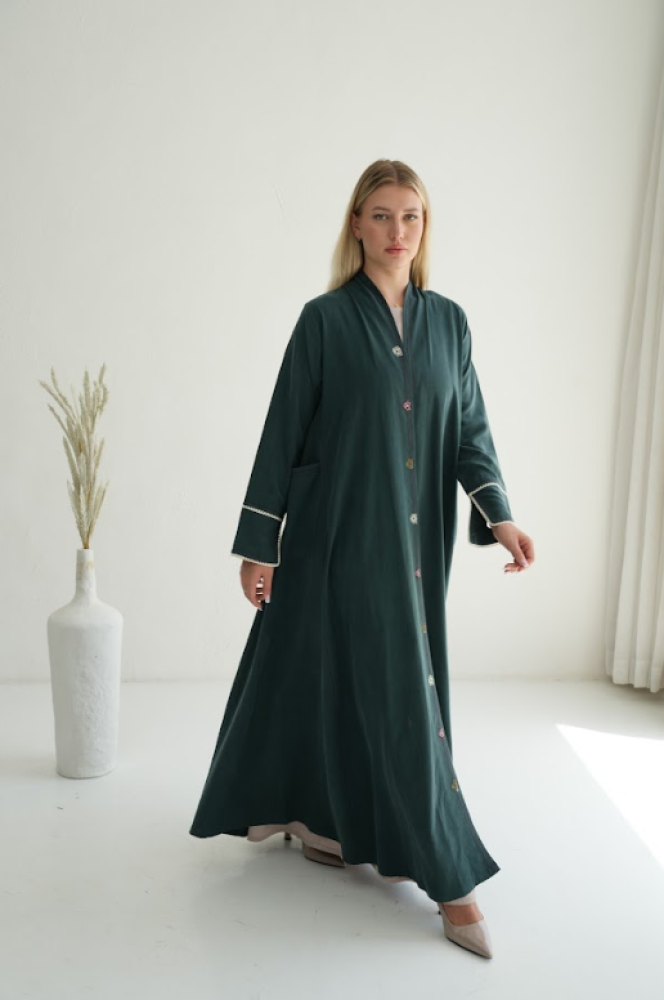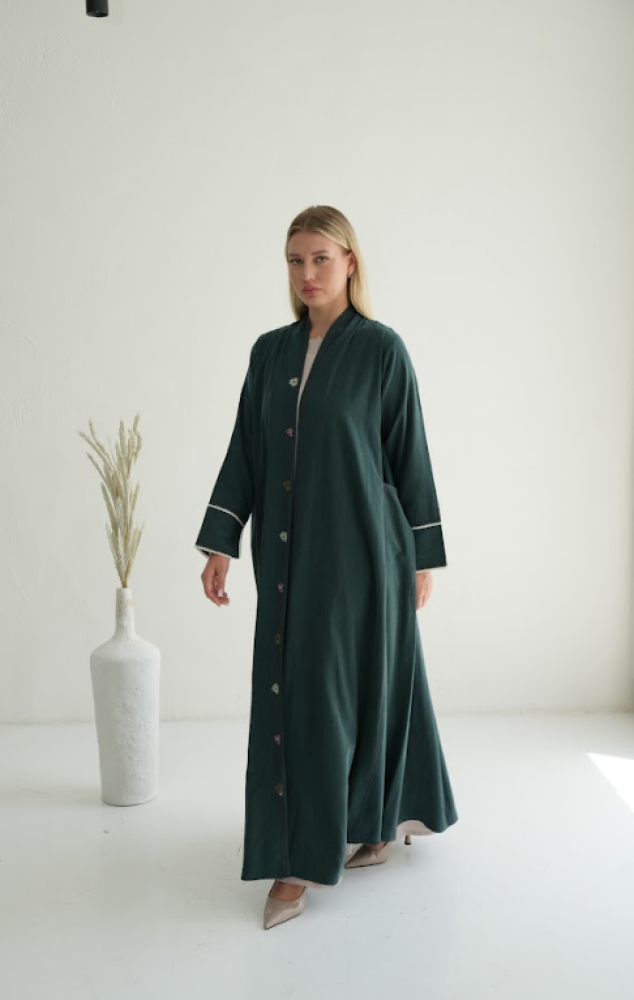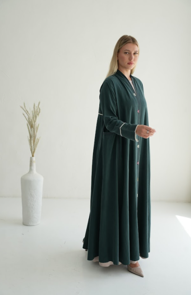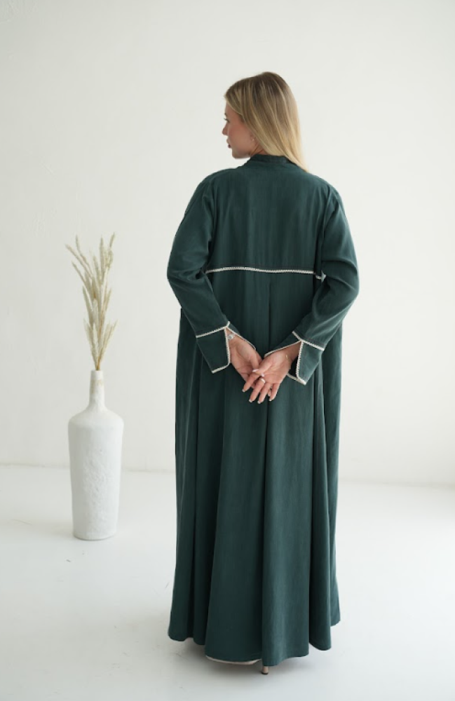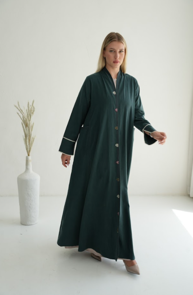 عباية قطن هندي لون زمردي الفاخر ممزوج بالحرير بنسبة ١٠٪ . مزودة بوردات كروشيه يدوي على الصدر. أضف لمسة من الأناقة إلى خزانة ملابسك مع هذه العباية الفاخرة من .